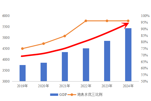 2019-2024年示范区GDP变化及地表水水质类别比例变化