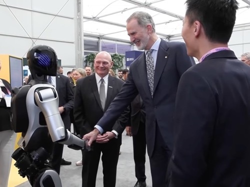 展会首日,西班牙国王费利佩六世在参观未来机场展厅时,“远征A2” 化身智能向导,全程流畅引导并讲解,陪同国王完整参观展厅。国王对 “远征A2” 在迎宾接待等复杂人机交互场景中展现出的成熟应用能力给予了高度评价,并与其亲切握手互动。